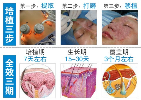 通过仪器操作,从自身正常皮肤提取分离正常健康黑色素细胞,提取好后再经过培植分离,处置白斑部位然后再把提取培植分离好的黑色素细胞介入的白斑的部位同时配合细胞营养液,黑色素生长因子促使细胞吸收,包扎七天后拆敷料就能看见明显效果。